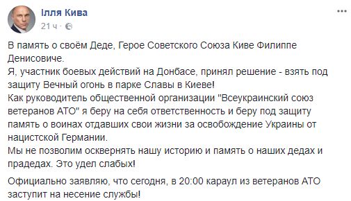 "Я, участник боевых действий на Донбасе, принял решение — взять под защиту Вечный огонь в парке Славы в Киеве! Как руководитель общественной организации "Всеукраинский союз ветеранов АТО" я беру на себя ответственность и беру под защиту память о воинах, отдавших свои жизни за освобождение Украины от нацистской Германии", — написал Кива.