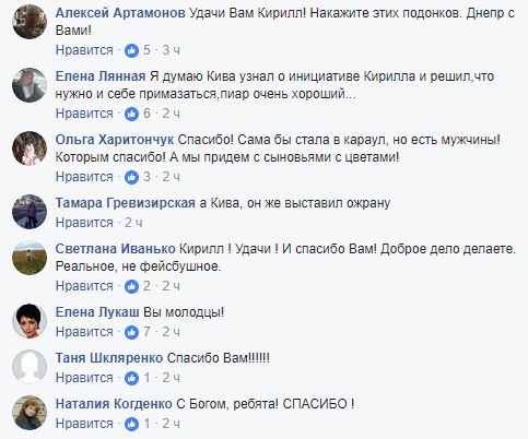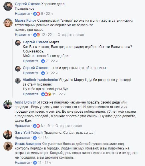 Люди в комментариях реагировали на эти инициативы по-разному. Многие поддерживали защиту вечного огня. "Тоже не понимаю как можно предать своего деда или прадеда . Ведь у всех у нас воевал кто то. И открещиватся от них и их победы- это позор, я считаю. Во мне кровь победителей, 70 лет моя страна в гордились победой , а сейчас просто с ума сошли . Нужное дело делаете, удачи Вам", - писали комментаторы под постом Кивы.