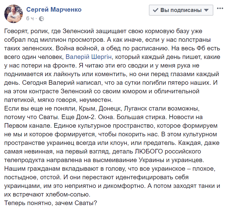 "Если вы еще не поняли, Крым, Донецк, Луганск стали возможны, потому что Сваты. Еще Дом-2. Окна. Большая стирка. Новости на Первом канале. Единое культурное пространство, которое формируем не мы и которое формируется, чтобы покорить нас", - уверен блогер.