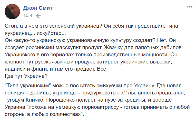 Он какую-то украинскую украиноязычную культуру создает? Нет. Он создает российский масскульт продукт. Жвачку для лапотных дебилов. Украинского в его сериалах только производственные мощности. Он клепает тут русскоязычный продукт, затирает украинские вывески, надписи и флаги, и там его продает. Все.