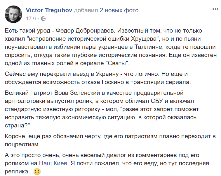 В списке запрещённых актёров и соотвественно их фильмов/ сериалов- 113 человек! И он ширится. При том, что открытую и скрытую торговлю с Россией ведут многие уважаемые политики - им за это - ничего, Госкино продолжает выдавать "прокатки" на сериалы, произведённые в РФ после 2014-го года, а этот вот точно запрещено законом, а Добронравову – бан на показ "Сватов"? Хотя за его производство налоги уплачены именно в украинский бюджет".