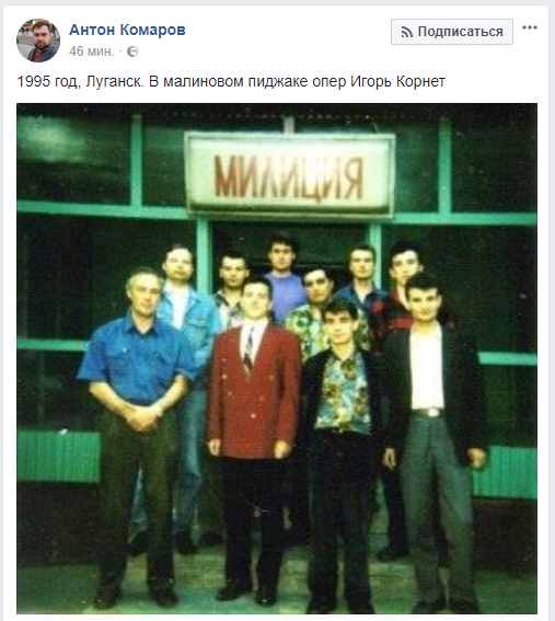 Фото сделано в 1995 году в Луганске. На тот момент оперуполномоченный Корнет стоит в красно-бордовом пиджаке в компании людей возле отделения милиции.