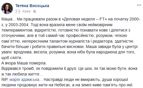 "Маша. Мы работали вместе в "Деловая неделя - FT" в начале 2000-х, в 2003-2004. Тогда она поразила меня своим невероятным темпераментом, открытостью, готовностью познавать новое и делиться с окружающими, но в то же время профессионализмом, умом, цепкой памятью, незаурядным талантом журналиста и редактора, способностью видеть больше и делать правильные выводы. Маша всегда была в центре внимания: красивая, веселая, умная, она как бы была рождена для того, чтобы сиять. А вчера Маша умерла. Оторвался тромб, как сообщили ее друзья. Это шок, как так может быть, она так любила жизнь ... RIP, Мария Адамская. На самом деле люди не умирают, душа хорошего человека продолжает жить на небесах, а на земле живет память о ней", - написала журналистка Татьяна Высоцкая.
