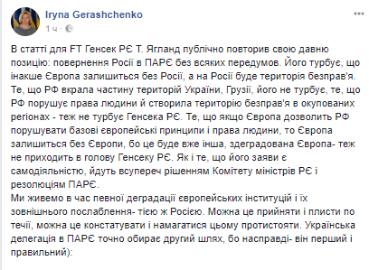 "То, что РФ украла часть территории Украины, Грузии, его не беспокоит, то, что РФ нарушает права человека и создала территорию бесправия в оккупированных регионах - тоже не беспокоит генсека СЕ. То, что если Европа позволит РФ нарушать базовые европейские принципы и права человека, то Европа останется без Европы, то это будет уже другая, деградированная Европа - тоже не приходит в голову генсеку СЕ. Как и то, что его заявления являются самодеятельностью, идут вопреки решениям Комитета министров СЕ и резолюциям ПАСЕ", - отметила Геращенко.