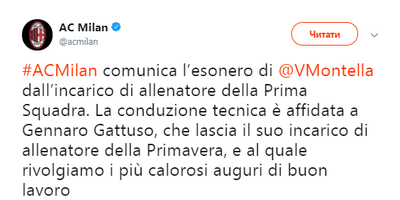 У руководства "Милана" лопнуло терпение и главному тренеру команды Винченцо Монтелле указали на дверь. Он отправлен в отставку в понедельник, 27 ноября, после того, как в 14 туре "Милан" сыграл сухую домашнюю ничью с "Торино".