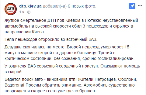 "Жуткое смертельное ДТП под Киевом в Лютеже: неустановленный автомобиль на высокой скорости сбил 3 пешеходов и скрылся в направлении Киева. Тела пешеходов отбросило во встречный ВАЗ", - говорится в сообщении.