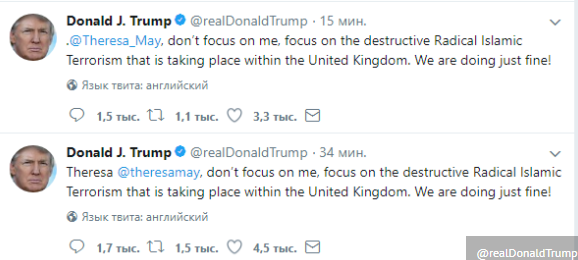 "Тереза, не фокусируйся на мне, сфокусируйся на разрушительном радикальном исламском терроризме, который творится в пределах Великобритании. Мы справляемся отлично", - написал Трамп.