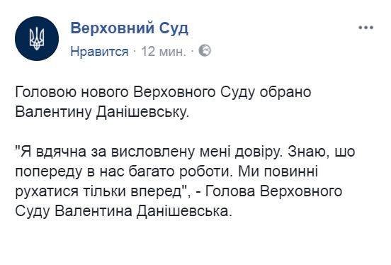 "Я благодарна за выраженное мне доверие. Знаю, что впереди у нас много работы. Мы должны двигаться только вперед", - заявила новый председатель Верховного Суда Данишевская.