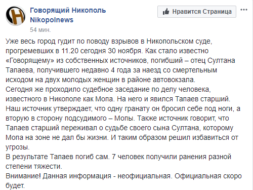 "Говорящий Никополь" в Facebook сообщает, что узнал из источников, что погибший – отец Султана Тапаева, получившего недавно 4 года за наезд со смертельным исходом на двух молодых женщин в районе автовокзала.