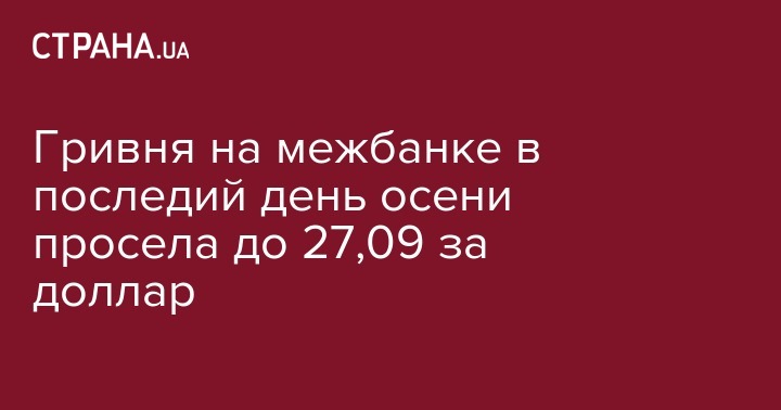 Сегодня, 30 ноября гривна на межбанковском валютном рынке снизилась на 2 копейки до 27,09 грн/$1 с 27,075 грн/$1 в предыдущий рабочий день. Об этом пишет "Интерфакс-Украина" со ссылкой на дилеров коммерческих банков.