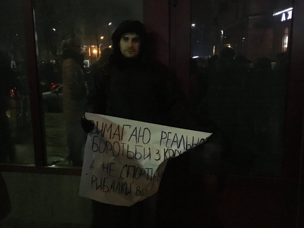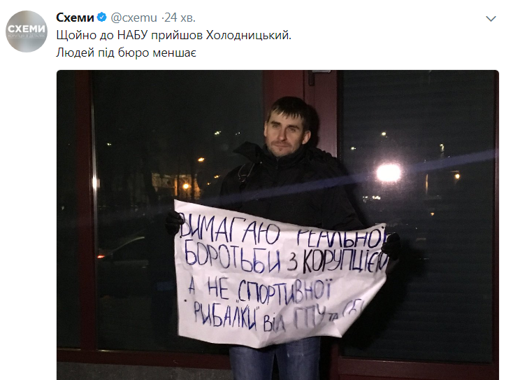 По данным журналистов "Схем", у здания НАБУ собрались активисты и рядовые граждане. Они держат лозунги: "Требую реальной борьбы с коррупицей, а не спортивной рыбалки ГПУ и СБУ".