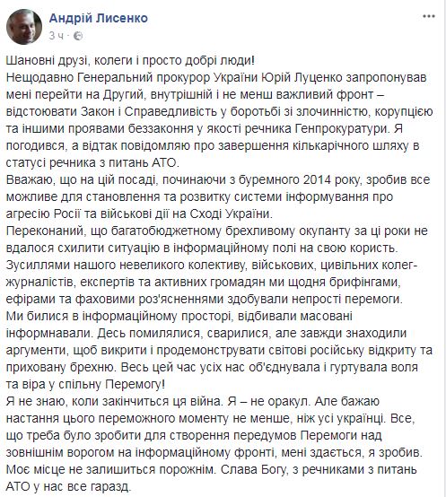 "Уважаемые друзья, коллеги и просто хорошие люди! Недавно генеральный прокурор Украины Юрий Луценко предложил мне перейти на Второй, внутренний и не менее важный фронт - отстаивать Закон и Справедливость в борьбе с преступностью, коррупцией и другими проявлениями беззакония в качестве спикера Генпрокуратуры. Я согласился, и поэтому сообщаю о завершении многолетнего пути в статусе спикера по вопросам АТО", - сообщил Лысенко.