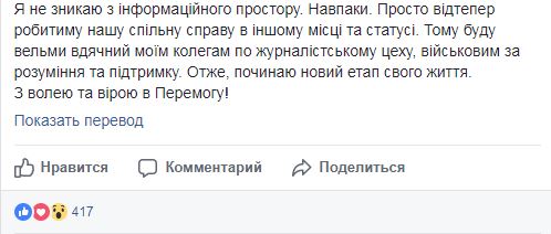 Он также отметил, что в должности спикера Минобороны по вопросам АТО, начиная с 2014 года, сделал все возможное для становления и развития системы информирования об агрессии России и добавил, что место спикера не останется пустым.