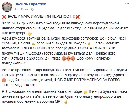 "02.12.2017Рр. - около шестнадцатого часа на пешеходном переходе сбили нашего старшего сына Адама, сразу скажу что с ним сейчас уже все хорошо", - сообщил он.