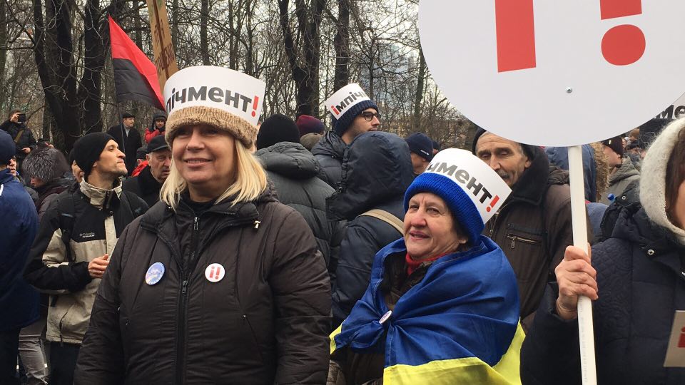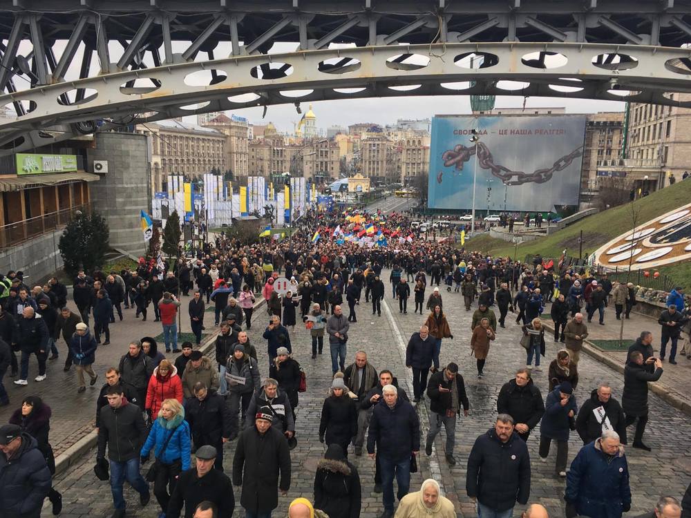 12:09 Сейчас митингующие выстраиваются в колону на перекрестке улицы Владимирской и Проспекта победы. Выйдут через бульвар Шевченко на Крещатик и пройдут до аллеи героев Небесной сотни. А потом пойдут на Банковую к Порошенко.