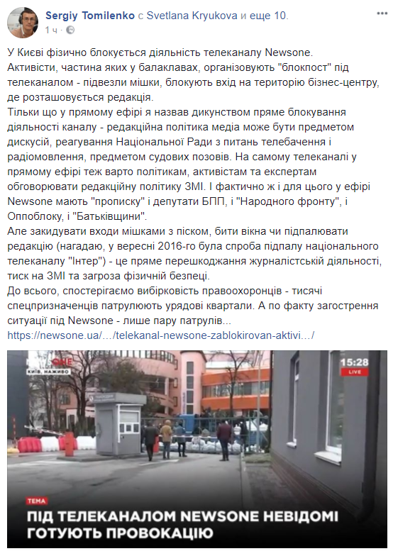 "В Киеве физически блокируется деятельность телеканала Newsone. Активисты, часть которых в балаклавах, организуют "блокпост" под телеканалом - подвезли мешки, блокируют вход на территорию бизнес-центра, где располагается редакция. Только что в прямом эфире я назвал дикостью прямое блокирование деятельности канала - редакционная политика медиа может быть предметом дискуссий, реагирования Национального Совета по вопросам телевидения и радиовещания, предметом судебных исков. В самом телеканале в прямом эфире тоже стоит политикам, активистам и экспертам обсуждать редакционную политику СМИ. И фактически же и для этого в эфире Newsone имеют "прописку" и депутаты БПП, и "Народного фронта", и Оппоблока, и "Батькивщины". Но забрасывать входы мешками с песком, бить окна или поджигать редакцию (напомню, в сентябре 2016-го была попытка поджога национального телеканала "Интер") - это прямое препятствование журналистской деятельности, давление на СМИ и угроза физической безопасности", - заявил Томиленко.