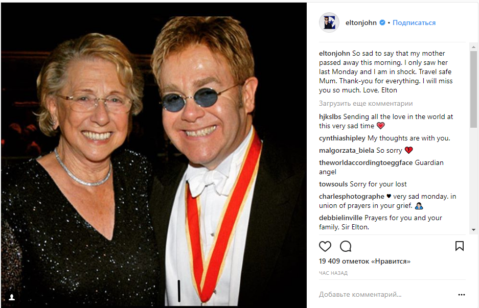 У британского музыканта Элтона Джона умерла 92-летняя мать Шейла Фэйрбразер. Печальной новостью артист поделился в Instagram.