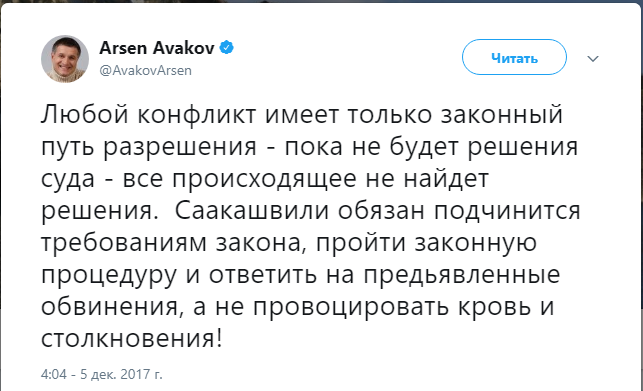 "Любой конфликт имеет только законный путь разрешения - пока не будет решения суда - все происходящее не найдет решения. Саакашвили обязан подчинится требованиям закона, пройти законную процедуру и ответить на предьявленные обвинения, а не провоцировать кровь и столкновения!", - заявил Аваков.