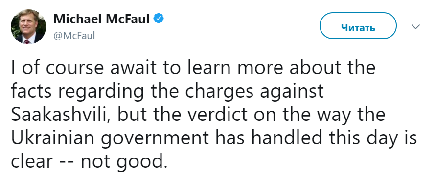 "Я, конечно, ожидаю услышать больше фактов в обвинениях против Саакашвили, но вывод о том, как украинское правительство справилось (с обвинениями - ред.) сегодня, очевиден - не очень хорошо", - написал в Twitter бывший посол США в России Майкл Макфол.