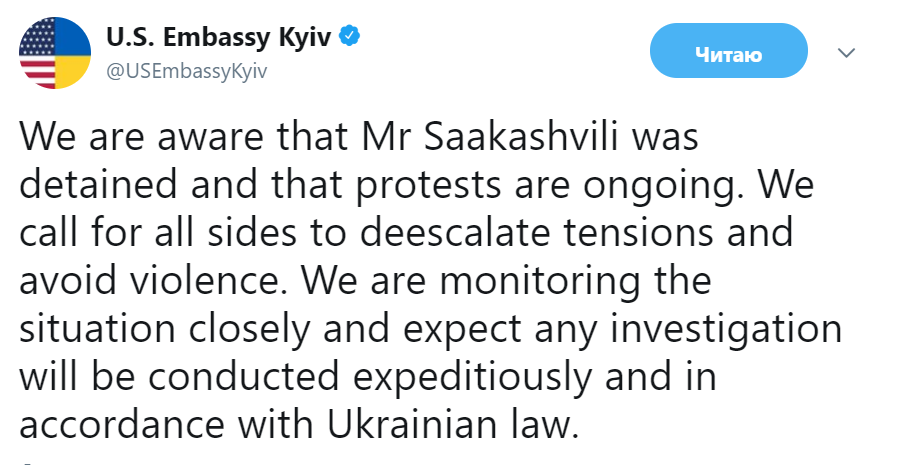 "Мы знаем, что г-н Саакашвили был задержан и что протесты продолжаются. Мы призываем все стороны к деэскалации напряженности и предотвращению насилия. Мы внимательно следим за ситуацией и ожидаем, что любое расследование будет проведено оперативно и в соответствии с законодательством Украины", - написали в Twitter киевского диппредставительства.