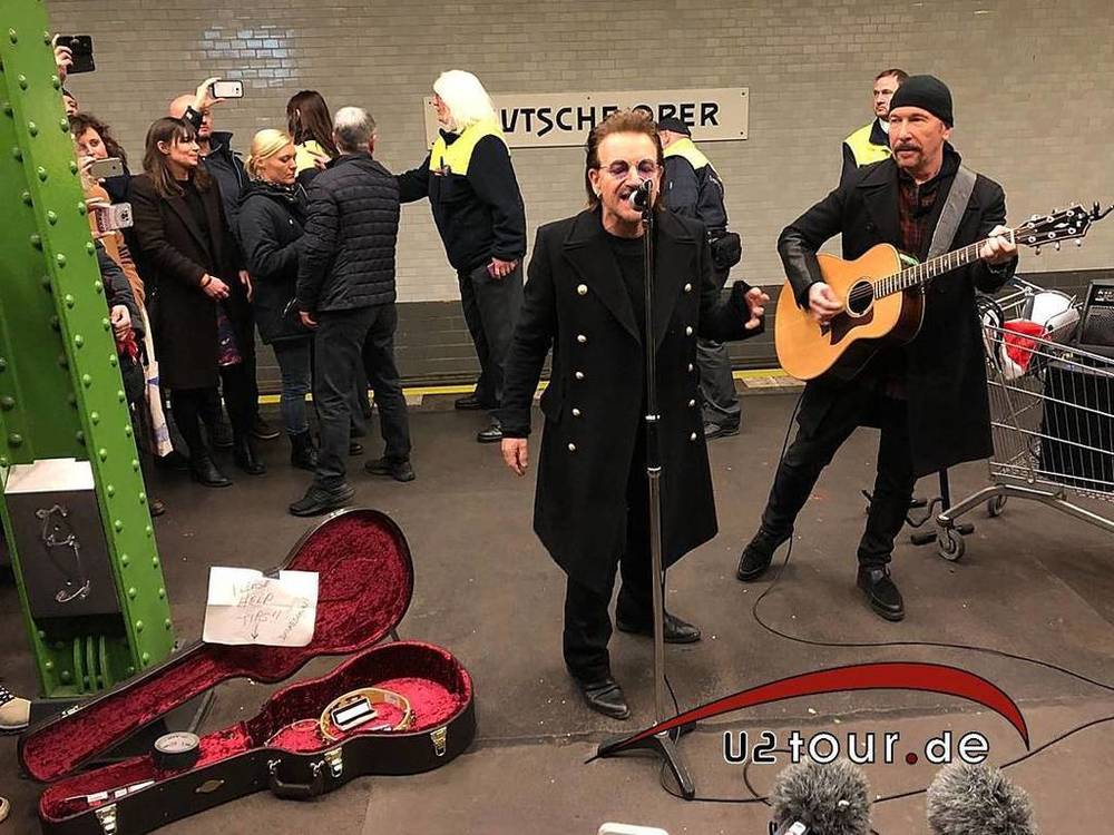 Выйдя на станции "Немецкая опера", артисты сыграли несколько песен, в том числе "Sunday Bloody Sunday" и "One". Во время выступления перед ними лежал открытый футляр от гитары с запиской на английском и немецком языках: "Пожалуйста, помогите чаевыми. Спасибо". После концерта музыканты фотографировались с поклонниками.