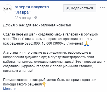 "Cделан первый шаг к созданию медиа галереи - в большом зале "Лавры" появилась панорамная проекция на стену (разрешение 5280х800, 15 000 (3000х5) люменов). А это значит, что отныне все художники, работающие в направлении диджитал арт, могут демонстрировать свои работы, например, ожившие картины, здесь! Это - первый шаг к созданию цифровой галереи с проекционными стенами, потолком и полом!", - говорится в сообщении.