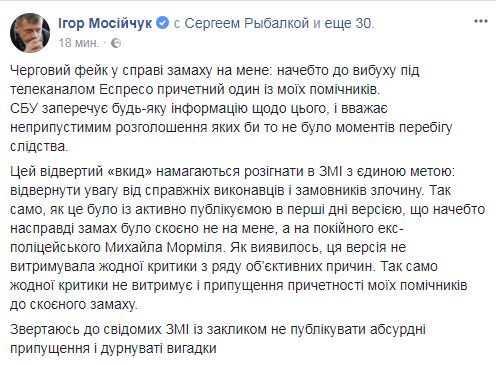 "Очередной фейк в деле покушения на меня: вроде бы к взрыву под телеканалом Эспрессо причастен один из моих помощников. СБУ отрицает любую информацию относительно этого, и считает недопустимым разглашение каких бы то не было моментов хода следствия", - отмечает он.