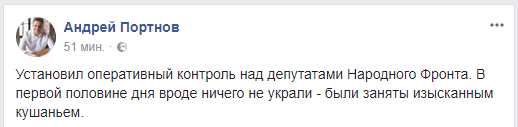 "Установил оперативный контроль над депутатами Народного Фронта. В первой половине дня вроде ничего не украли - были заняты изысканным кушаньем", - подписал видео Портнов.
