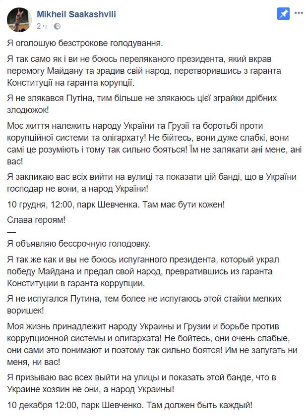 Моя жизнь принадлежит народу Украины и Грузии и борьбе против коррупционной системы и олигархата! Не бойтесь, они очень слабые, они сами это понимают и поэтому так сильно боятся! Им не запугать ни меня, ни вас!", пишет Саакашвили.