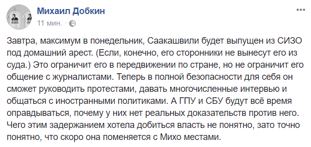 0.27 - "Завтра, максимум в понедельник, Саакашвили будет выпущен из СИЗО под домашний арест. Если, конечно, его сторонники не вынесут его из суда. Это ограничит его в передвижении по стране, но не ограничит его общение с журналистами. Теперь в полной безопасности для себя он сможет руководить протестами, давать многочисленные интервью и общаться с иностранными политиками. А ГПУ и СБУ будут всё время оправдываться, почему у них нет реальных доказательств против него. Чего этим задержанием хотела добиться власть не понятно, зато точно понятно, что скоро она поменяется с Михо местами", прогнозирует в своем Facebook Михаил Добкин.