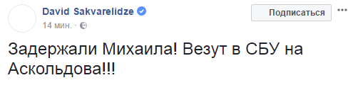 Позже эту информацию подтвердил соратник Саакашвили Давид Сакварелидзе в Facebook. Он написал, что Михаила Саакашвили везут в Управление СБУ, расположенное в Аскольдовом переулке города Киева.