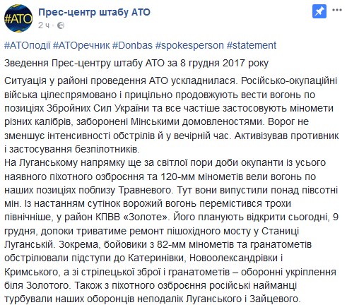 Отмечается, что на луганском направлении эпицентром нестабильности остается Светлодарская дуга, где враг несколько раз из минометов различных калибров и всего спектра пехотного вооружения и БМП вел огонь вблизи Луганского и Майского; возле Майского боевики выпустили более полусотни мин калибра 120 мм.