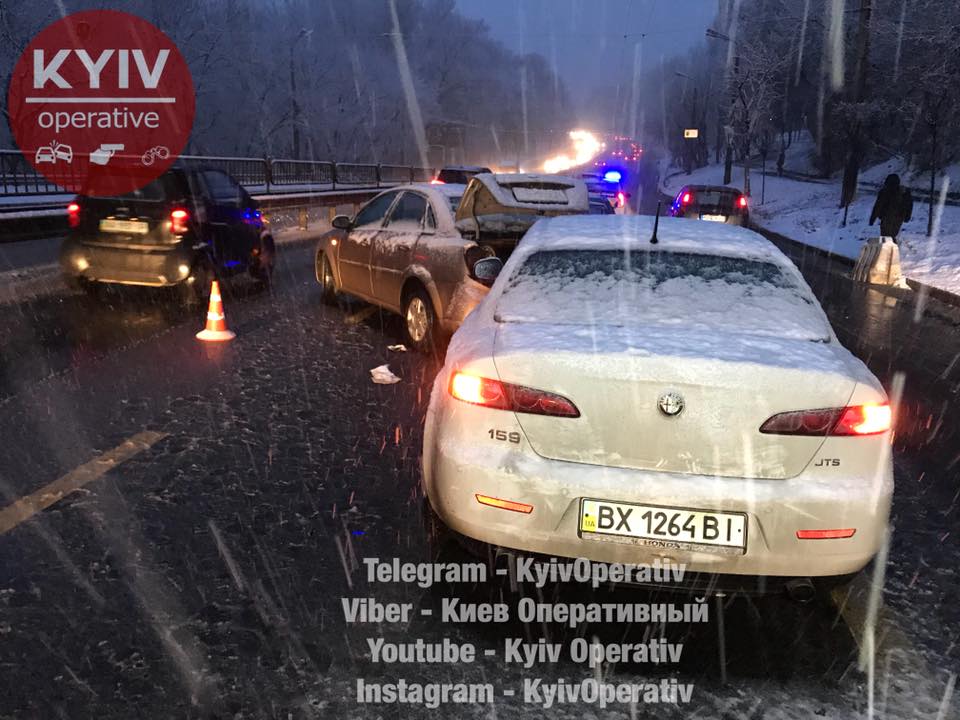 Тройная авария и сильный снег парализовали движение на Елены Телиги в Киеве