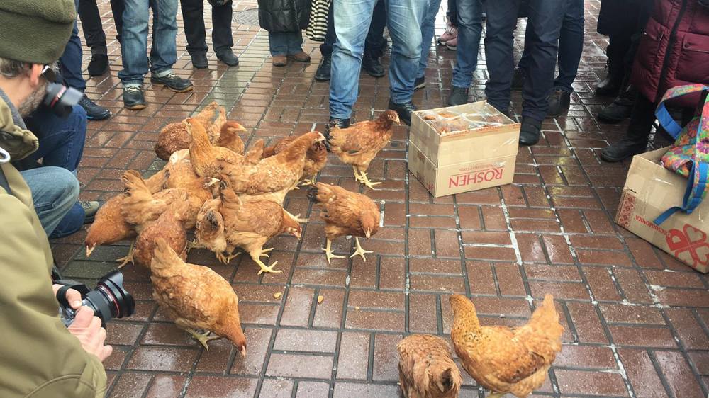 11:57 У Печерского суда активисты выпустили кур. Намек на Курченко?