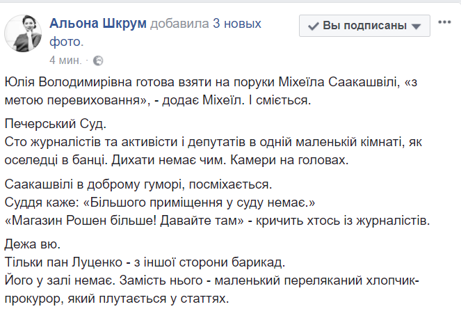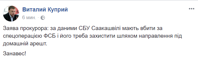 16:14 "Заявление прокурора: по данным СБУ Саакашвили должны убить в рамках спецоперацией ФСБ, и его надо защитить путем направления под домашний арест.