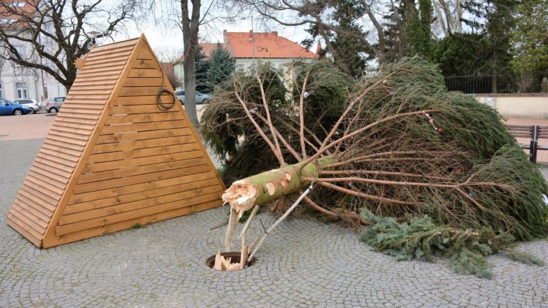 Силы ветра не выдержала и сломалась рождественская елка на площади святой Троицы в городе Ступава. Дерево с площади убрали коммунальные службы.