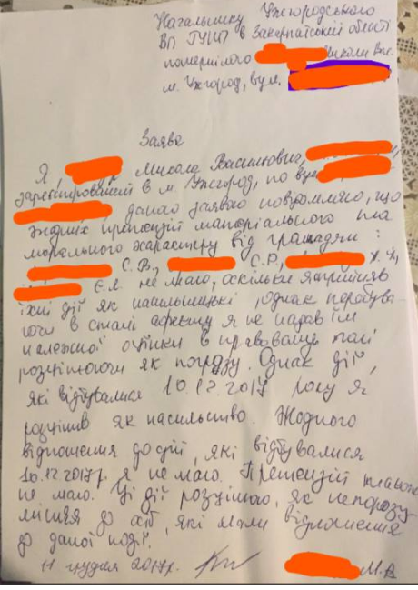 Общественный деятель Сергей Носалюк обнародовал фото заявления ужгородца. Там говорится, что у него нет никаких претензий и, что находился в состоянии аффекта, поэтому не составил адекватную оценку действиям мужчин.