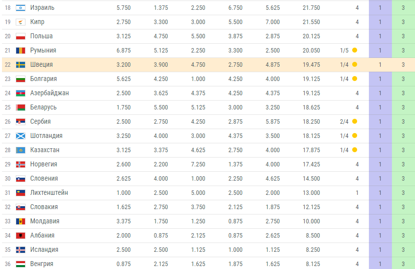 Украина занимает в рейтинге 8 место, на 1,633 балла опережая Бельгию, и на три пункта отставая от Португалии.