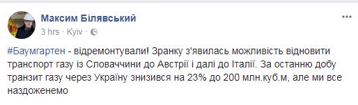 Об этом сообщил советник министра энергетики и угольной промышленности Максим Билявский на своей странице в социальной сети Facebook.