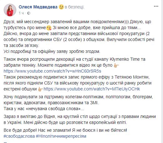 "Действительно, вчера ко мне пришли представители военной прокуратуры (2 человека) и оперативники СБУ (2 человека). Изъяли личные вещи и средства связи. Все подробности и официальное заявление сделаю впоследствии. Также вчера разбили декорации на студии канала Klymenko Time и забрали технику", - сообщила она.