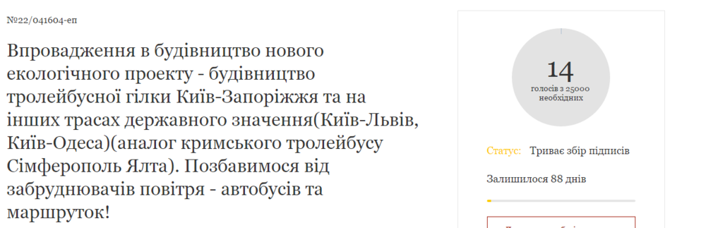 На сайте петиций к президенту Украины появилось обращение с просьбой построить троллейбусную линию между Киевом и Запорожьем, а также на других трассах государственного значения, например между Киевом и Львовом, Киевом и Одессой и т. д.