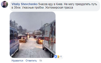 "5 часов еду в Киев. Не могу преодолеть путь в 35 км. Ужасные пробки. Житомирская трасса", - жалуется один из водителей.