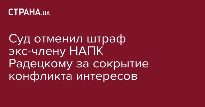 Бывшему зампредседателя Национального агентства по предотвращению коррупции (НАПК) Руслану Радецкому Апелляционный суд Киева отменил 6,8 тыс. гривен штрафа за несообщение о конфликте интересов.