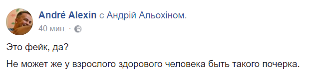 "Это фейк, да? Не может же у взрослого здорового человека быть такого почерка", - написал Алехин в Facebook.