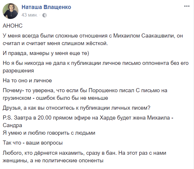 Телеведущую Наталью Влащенко тоже удивляет факт публикации личного письма: