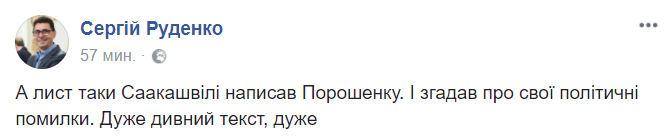 "А письмо таки Саакашвили написал Порошенко. И вспомнил о своих политических ошибках. Очень странный текст, очень", - вторит Уколову журналист Сергей Руденко.