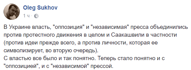 "В Украине власть, "оппозиция" и "независимая" пресса объединились против протестного движения в целом и Саакашвили в частности (против идеи прежде всего, а против личности, которая ее символизирует, во вторую очередь).