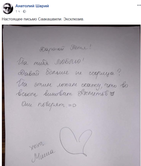 В унисон ему журналистка Татьяна Высоцкая призвала передать текст на экспертизу графологу. А журналист Анатолий Шарий в насмешку выложил свой вариант "письма Саакашвили":