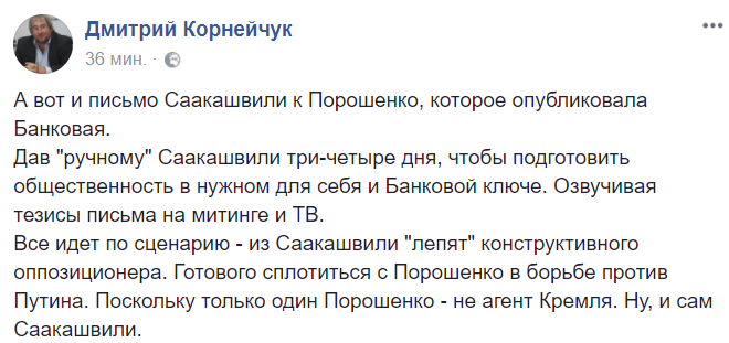 "Все идет по сценарию - из Саакашвили "лепят" конструктивного оппозиционера. Готового сплотиться с Порошенко в борьбе против Путина. Поскольку только один Порошенко - не агент Кремля. Ну, и сам Саакашвили", - считает Корнейчук.