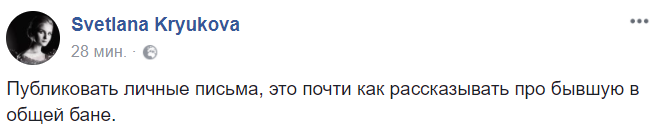 "Публиковать личные письма, это почти как рассказывать про бывшую в общей бане", - согласна с этим журналист Светлана Крюкова.